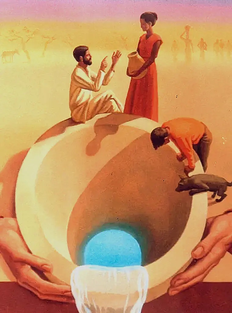 For the woman at the well, the dialogue about thirst was the starting point for a deep spiritual journey. At the beginning of their conversation, the woman assumes that Jesus is merely a thirsty Jewish traveler. As they converse about the water she could draw and the living water Jesus offers, she begins to recognize something extraordinary in this encounter. And so, she asks him to give her this never-ending supply of water.