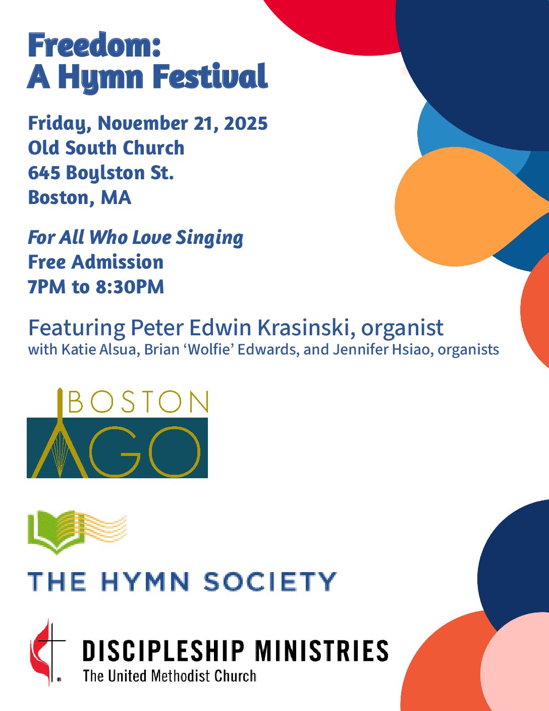 On Friday, November 21, at 7:00 PM, join us at the historic Old South Church (645 Boylston St.) for Freedom: A Hymn Festival, co-sponsored with the Boston chapter of the American Guild of Organists. This free public event will feature congregational singing led by Boston-based organists Peter Edwin Krasinski, Katie Alsua, Brian “Wolfie” Edwards, and Jennifer Hsiao, alongside nationally recognized song leaders. The program will include global hymnody, contemporary texts, and musical expressions of lament, resistance, and hope, drawing on Isaiah 61 and featuring works by David Bjorlin, Hannah Brown, Carl P. Daw, Jr., FHS, Jeanette Lindholm, as well as songs from Taiwan and South Africa.